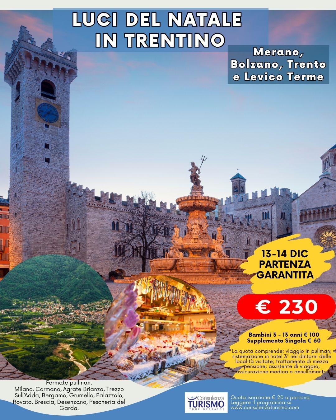 Partenza al mattino presto alla volta del Trentino. Il Mercatino di Natale di Trento si svolgerà in piazza Fiera e piazza Mostra con decine di casette di legno nelle quali si possono trovare principalmente prodotti artigianali del territorio, specialità gastronomiche tipiche e ottimi vini da degustare. Il fiore all’occhiello degli stand gastronomici è l’angolo gourmet “Sapori del Mercatino”, in cui si propone la degustazione di squisite specialità trentine e altoatesine. Trento, nel cuore delle Alpi, ha una storia millenaria, fatta di tradizione mitteleuropea e cultura italiana come testimoniano lo spazio archeologico sotterraneo “Tridentum romana”, i palazzi nobiliari cinquecenteschi, il Castello del Buonconsiglio, la Basilica paleocristiana nel sottosuolo della Cattedrale di San Vigilio, il modernissimo Museo delle Scienze disegnato da Renzo Piano. Tempo a disposizione per le visite individuali e il pranzo libero. Nel pomeriggio trasferimento nel Mercatino di Natale Asburgico a Levico Terme: il sapore di una favola antica che prende vita nel Parco Secolare degli Asburgo, un luogo incantato dove grandi e piccini potranno lasciarsi trasportare dalle emozioni passeggiando tra le caratteristiche casette di legno ed esplorando le eccellenze dell'artigianato locale e i sapori autentici della tradizione alpina. Trasferimento in albergo per la cena e il pernottamento.