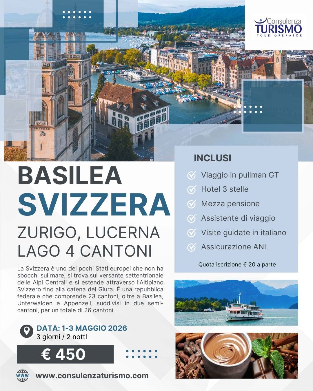 Prima colazione e trasferimento a Basilea, sul fiume Reno nella parte nord-ovest della Svizzera, nei pressi dei confini con la Francia e la Germania. Il centro storico medievale si sviluppa intorno alla piazza Marktplatz, dominata dal municipio in mattoni rossi del XVI secolo. La cattedrale gotica del XII secolo si affaccia sulla città e contiene la tomba di Erasmo, studioso olandese del XVI secolo. L'università di Basilea possiede alcune opere di Erasmo. Una passeggiata tra le vie del centro consente di ammirare edifici antichi del XV secolo che si armonizzano con il lavoro di architetti contemporanei, conosciuti a livello mondiale, in un quadro spettacolare e contemporaneamente elegante. Visita guidata della città. Pranzo libero. Pomeriggio a disposizione per godersi liberamente Basilea, la città dai mille contrasti. Una città svizzera in cui le opere architettoniche storiche si sposano con l’architettura moderna.